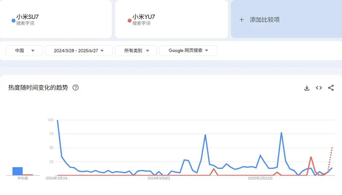 然而,時間快進到十幾個月后,詭異的事情發生了:根據谷歌趨勢和其他搜索引擎的數據分析,小米YU7公布售價當天的網絡熱度,甚至不到其“大哥”SU7的二分之一。沒有鋪天蓋地的發布會直播分析,沒有全民參與的“找像素級致敬”大賽,一切顯得有些“平淡”。