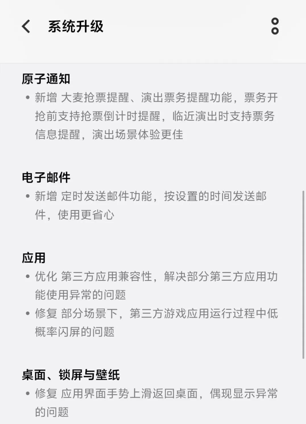 這次系統更新還改了通知功能,比如搶演唱會門票的時候能及時提醒,郵件也能設置定時發送。之前用第三方軟件偶爾會出現閃退或者黑屏,現在這些問題好像修好了。整體用起來也比以前穩定點,感覺系統更順手了。