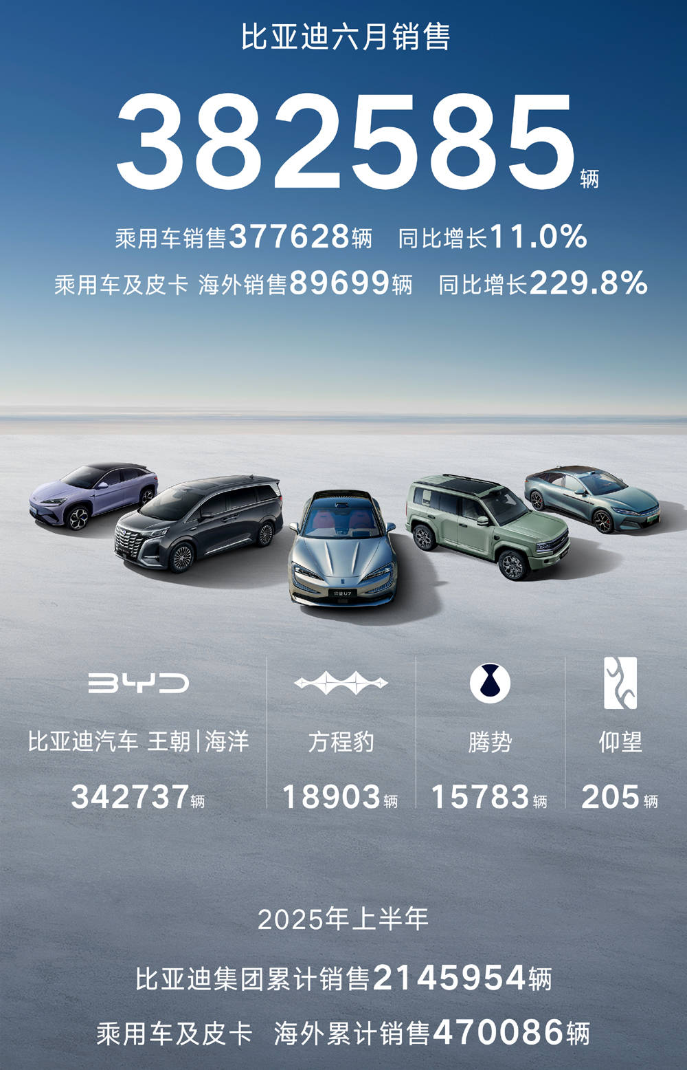 根據比亞迪的銷量快報顯示,在剛剛過去的6月份,比亞迪單月銷量達到了382585臺,其中,乘用車月銷377628臺,同比增長11%,海外出口為89699臺,同比增長229.8%。今年1-6月累計銷量2145954臺,其中,海外市場累計銷量470086臺。