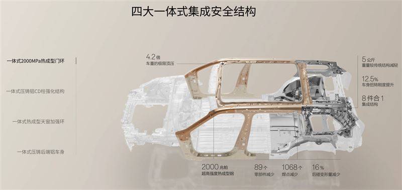安全性方面,極氪9X的前艙采用了行業首創第三吸能盒專利設計,以降低車輛遭遇碰撞事故時所受到的“侵入”。同時,新車的白車身高強鋼和鋁合金整體占比超過91%,1500兆帕以上的高強度熱成型鋼,和高強度鋁材的占比達到60%。在A柱、B柱、門板防撞梁等核心區域,更是應用了2000兆帕的超高強度熱成型鋼。這確保了極氪9X擁有“金剛鐵骨”,且車身扭轉剛度達到41600牛·米每度,達到行業領先水平。毫不夸張的說,極氪9X就是“混動公路坦氪”。