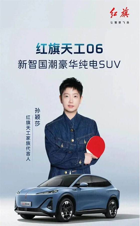 今年3月31日,孫穎莎正式成為紅旗天工家族代言人!這是汽車行業的一次重大突破,孫穎莎成為紅旗首位女性代言人,也是首位運動員代言人。