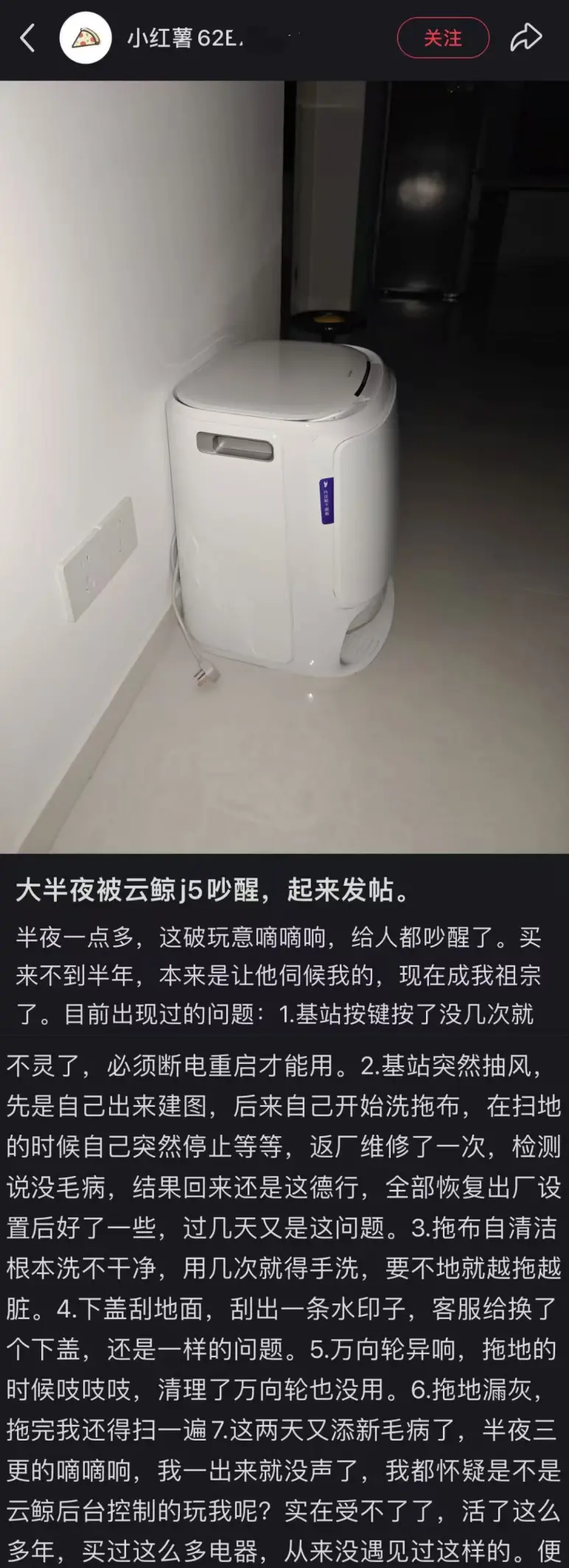 遼寧用戶“小紅薯6xxxx”在社交平臺上發文稱,其購買的云鯨J5在半夜一點多突然發出“嘀嘀”的響聲,將人吵醒。這僅僅是問題的開始。據該用戶描述,購買不到半年的機器出現了多項故障:基站按鍵很快失靈,必須斷電重啟才能使用;基站時常“抽風”,自動建圖、自動洗拖布,在掃地時突然停止;拖布自清潔不徹底,需要手動清洗。