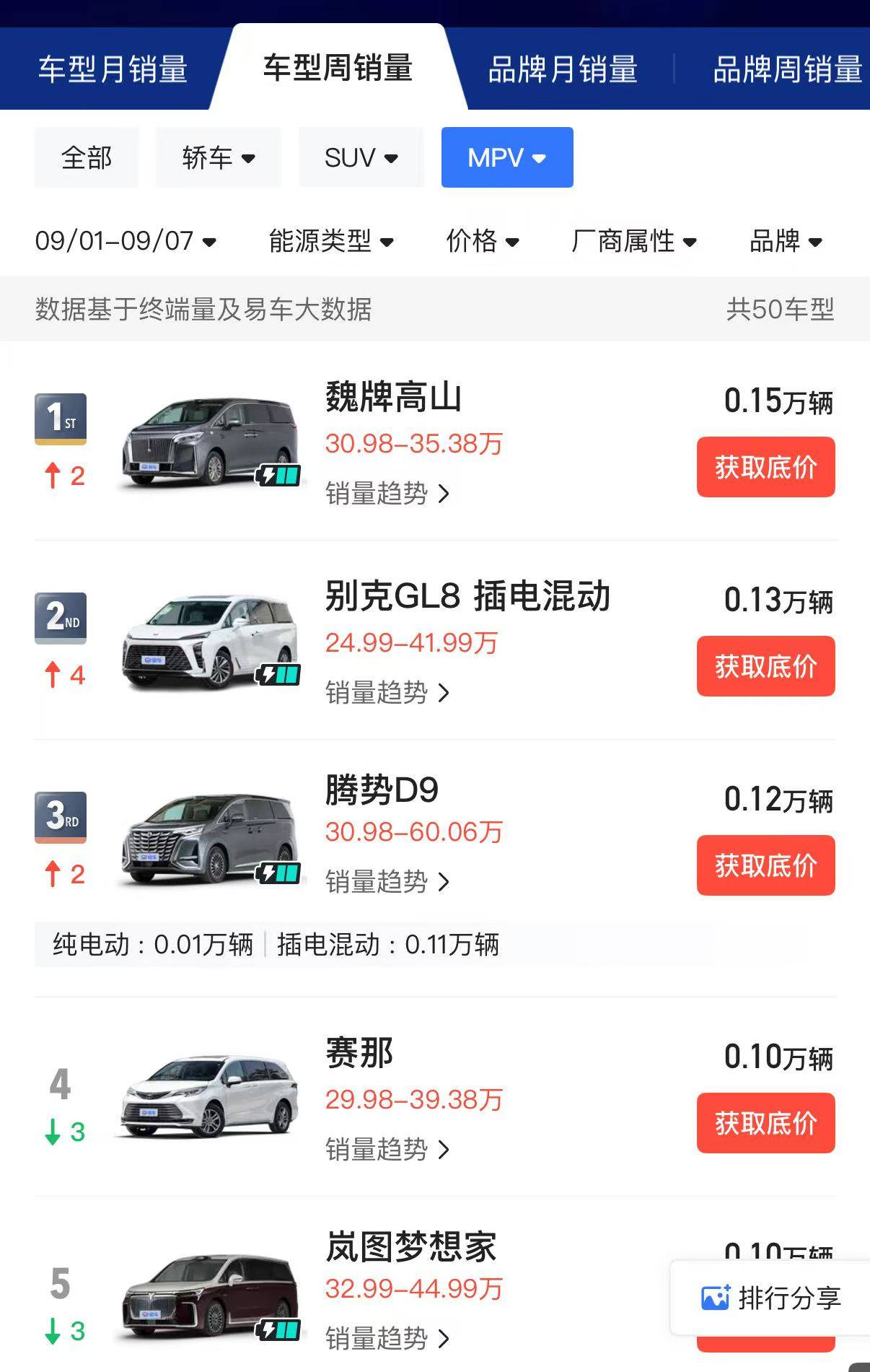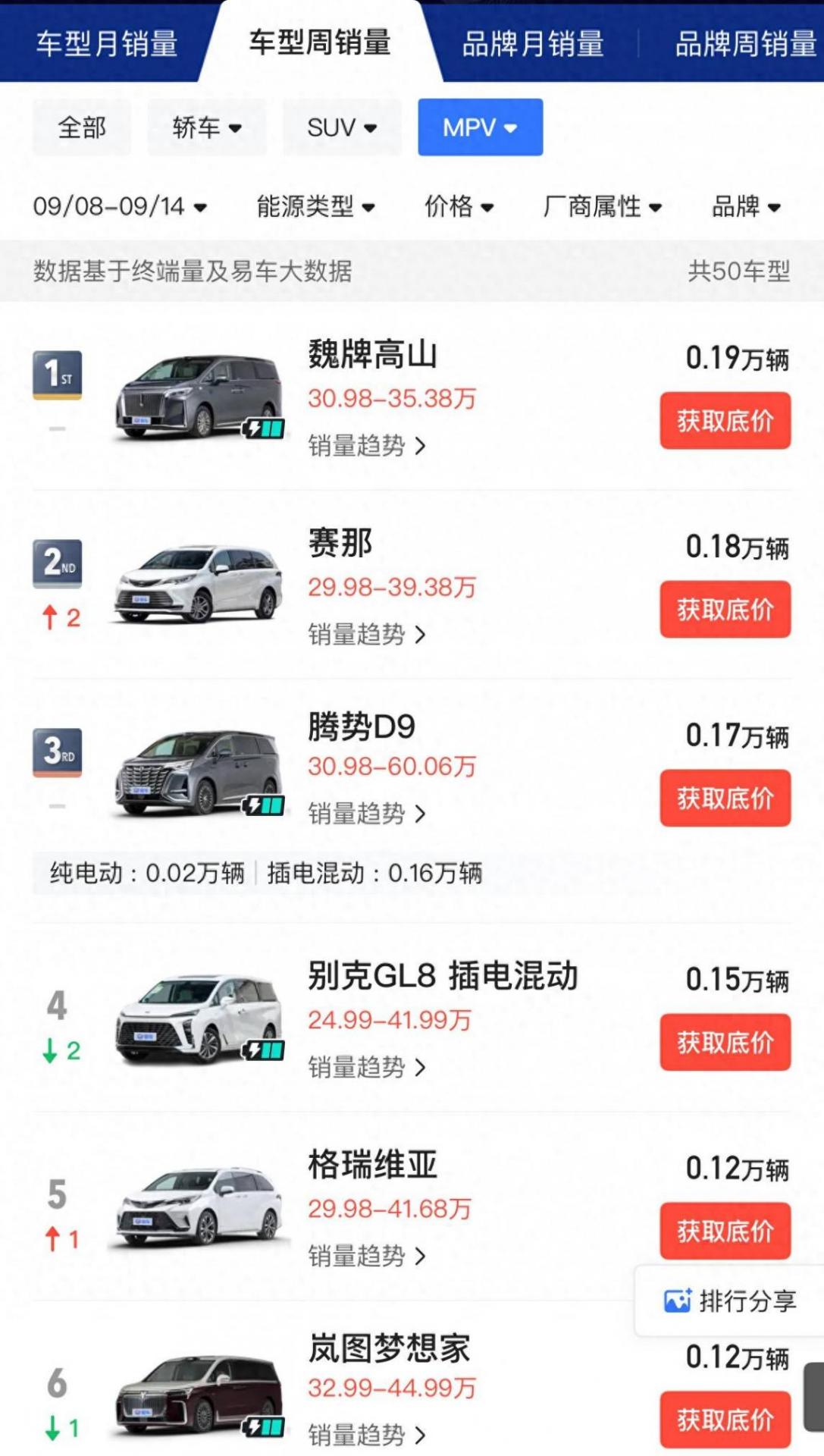 進入9月份,在MPV周榜榜單上,連續兩周排名第一的都是。盡管GL8燃油+PHEV的地位還是牢不可破,但在單一車系的排名上,對于冠軍的爭奪一直都很激烈。